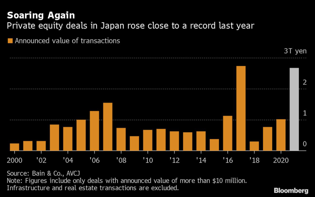The value of transactions more than doubled from the previous year to about 2.7 trillion yen ($20 billion), close to the record from 2017. Shiseido Co. and Hitachi Ltd., both founded more than a century ago, sold parts of their business to private equity last year.