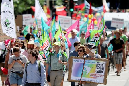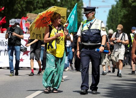 BERLIN (Reuters) – Some 4,000 people marched in Munich on Saturday calling on leaders of the Group of Seven industrialized countries to take action to fight poverty, climate change and world hunger and end dependence on Russian fossil fuels.
