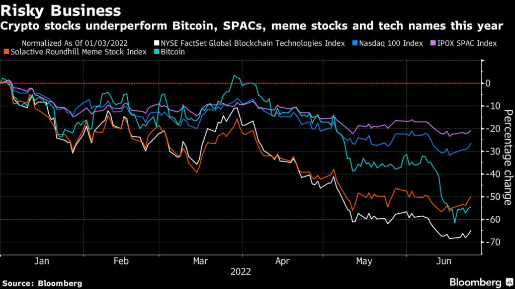 As the second-quarter winds down, cryptocurrency-related stocks are being lumped in with the digital tokens as one of the world’s riskiest asset classes.