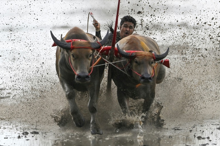 The main event sees four pairs of harnessed buffalo gallop across a decorated paddy field, with intrepid racers sprinting barefoot through the shallow muddy waters and attempting to both control their beasts and remain upright.