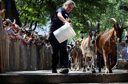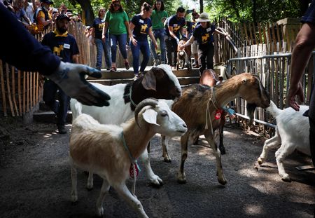 NEW YORK (Reuters) – More than a dozen goats journeyed to Riverside Park in New York City on Wednesday to feast on weeds, a chemical-free way to remove invasive species while adding to the joys of nature.