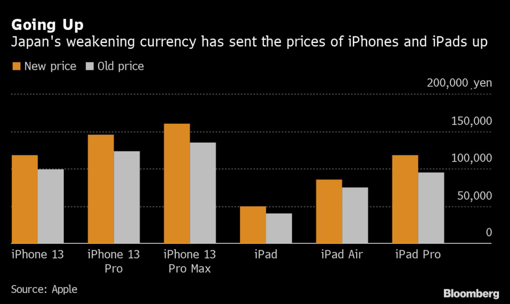 (Bloomberg) — Apple Inc. raised the prices of its iPhones and iPads in Japan in an uncommon move to account for the yen’s precipitous drop in value this year.