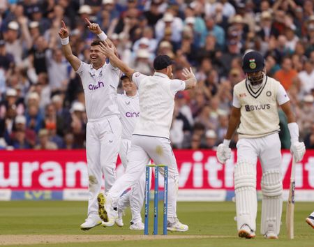 The veteran seamer drew first blood when he had opener Shubman Gill (17) caught at second slip by Zak Crawley and the same bowler-fielder combination sent back Cheteshwar Pujara for 13.