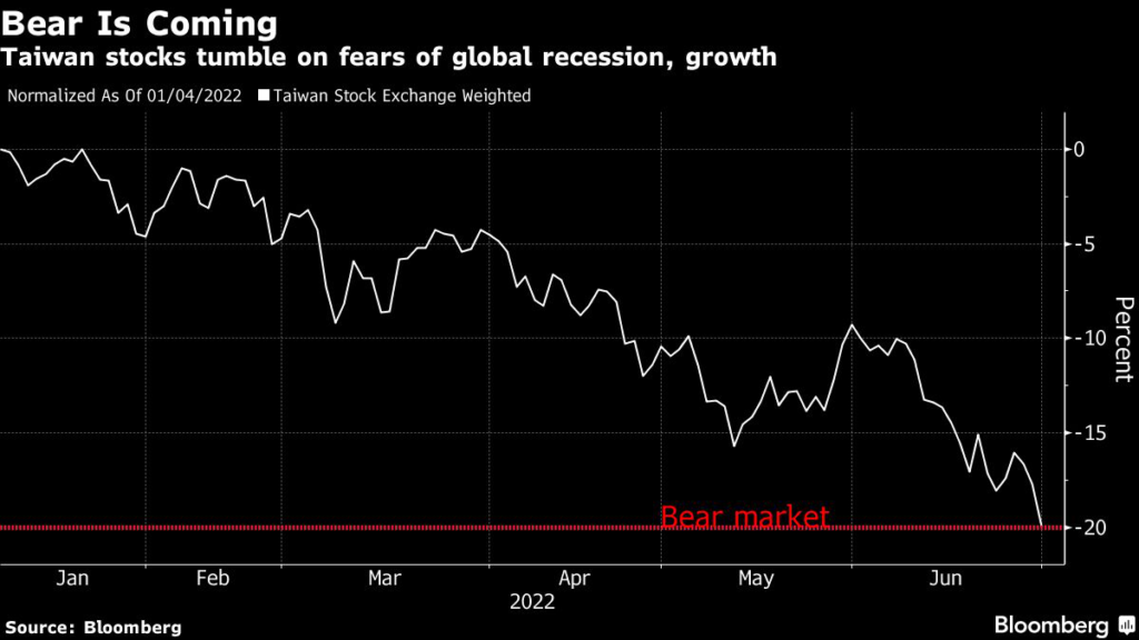 (Bloomberg) — Taiwan’s stock market slid again on Friday, taking its decline from a January high to over 20% and entered a bear market.