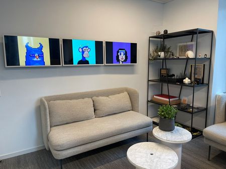 In his New York office, Bosc put up three screens on which to display his NFTs, which include various pixelated characters and a Bored Ape bought for $125,000.
