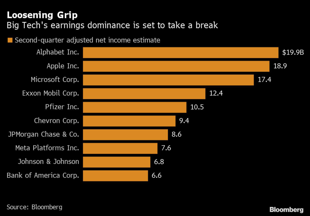 Big Tech’s earnings dominance is set to take a break as only four US technology firms — Alphabet, Apple, Microsoft Corp., and Meta Platforms — are expected to be among the top-ten earners in the latest batch of earnings reports.