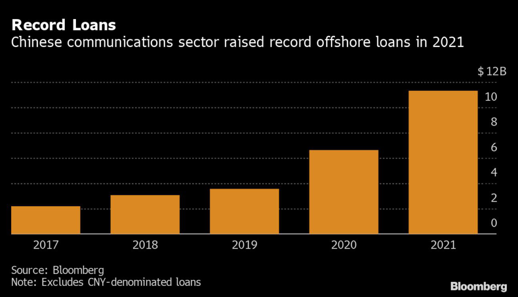 Chinese companies from the communications sector raised a record $11.3 billion of loans offshore in 2021, spurred by the likes of Bytedance and search engine Baidu Inc., according to Bloomberg data.