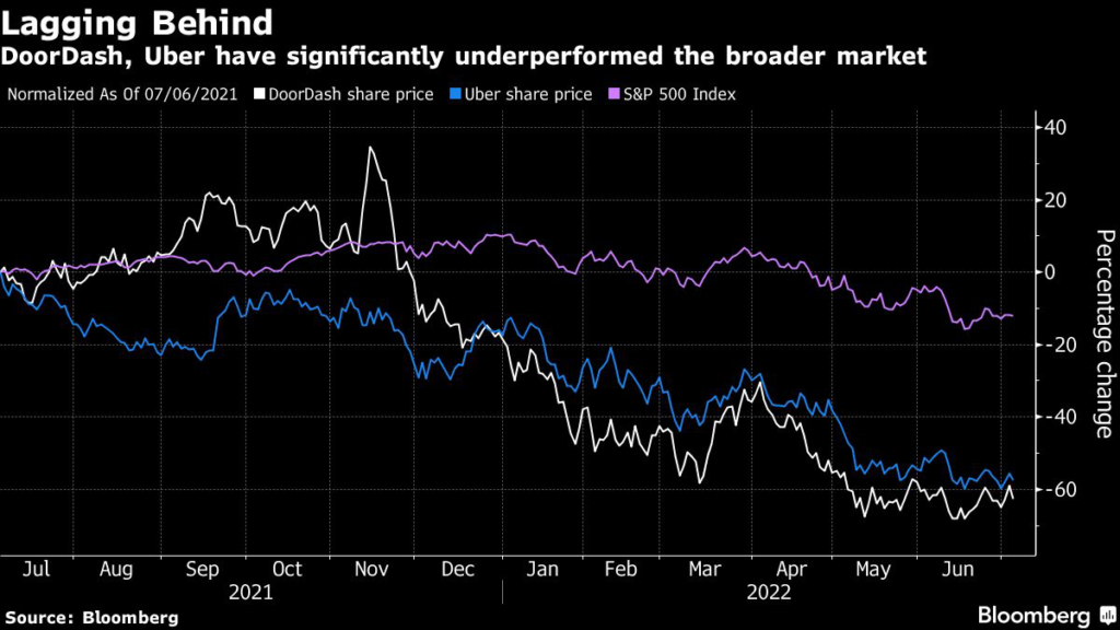 The rout in DoorDash’s stock this year has come as the severity of the pandemic waned and people started stepping out, weighing on demand for online food delivery.
