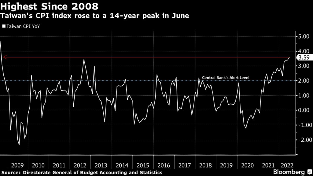 (Bloomberg) — Taiwan’s consumer inflation in June reached the highest level in 14 years, a swell that will put pressure on officials to consider how best to balance the possibility of interest rate hikes this year without hurting the local economy.