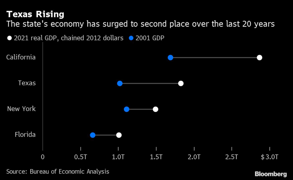 Its population boom propelled it to the second-biggest economy, after California, and it’s among the fastest-growing in the past 20 years. None of the restrictive laws passed by the state legislature and signed by Republican Governor Greg Abbott are threatening its prosperity in the foreseeable future.