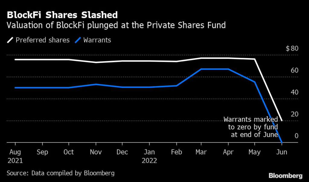 It also cut its valuation of BlockFi’s preferred shares to about $20 per share, down from $77 at the end of April.