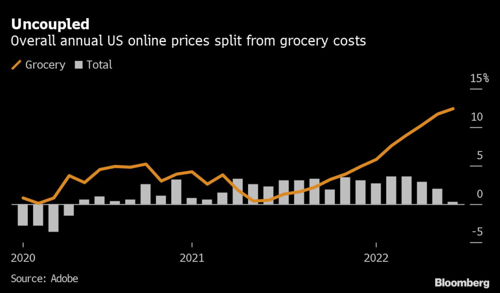 (Bloomberg) — The inflation rate for goods purchased online in the US slowed sharply last month, according to the Adobe Digital Price Index, though there was no letup in food prices which rose at the fastest pace on record.