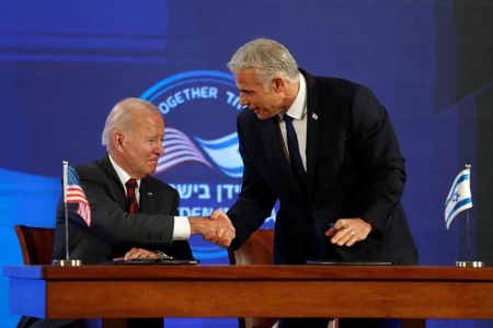 JERUSALEM (Reuters) -U.S. President Joe Biden and Israeli Prime Minister Yair Lapid signed a joint pledge on Thursday to deny Iran nuclear arms, a show of unity by allies long divided over diplomacy with Tehran.