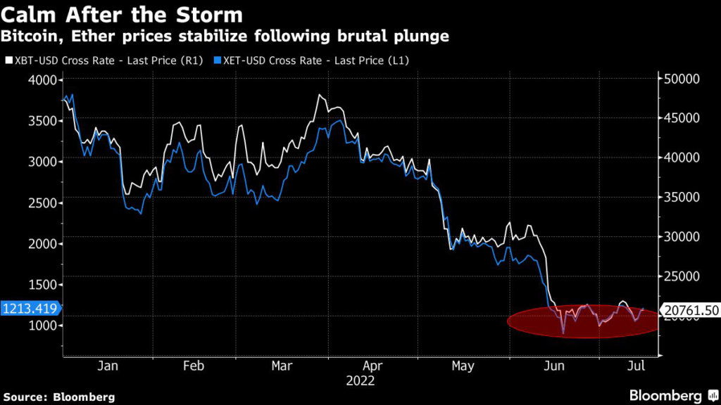The relative stabilization in the charts is fueling hopes that contagion may have run its course following the spectacular collapse of tokens on the Terra blockchain, a wipeout that also sent hedge fund Three Arrows Capital and brokerage Voyager Digital into bankruptcy court.