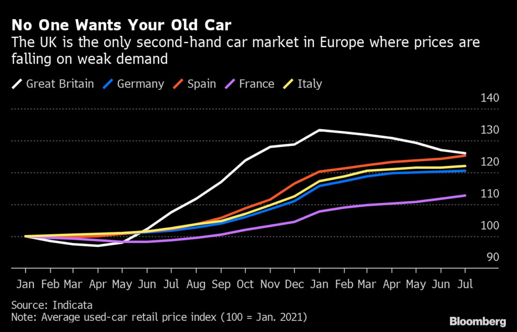 (Bloomberg) — Used cars, which pushed up UK inflation during the pandemic, are now getting cheaper as Britons offload their vehicles in response to soaring fuel costs and a broader squeeze on household budgets.