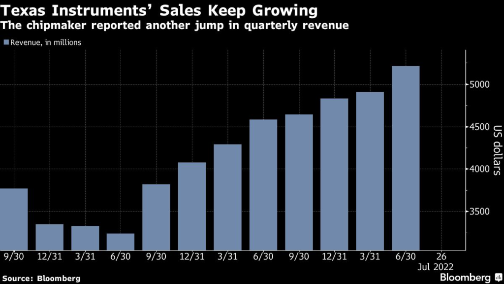 (Bloomberg) — Texas Instruments Inc., the maker of chips used in everything from washing machines to satellites, gave a bullish forecast for the current period, countering concern that a slowing economy is hurting demand for electronics.
