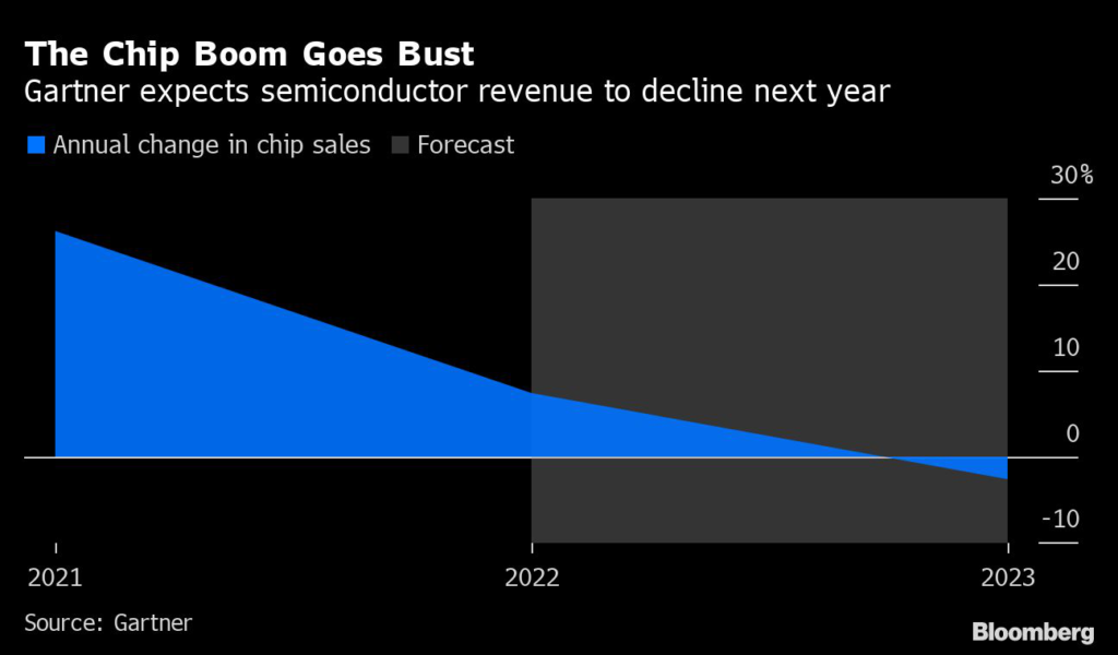 (Bloomberg) — Chip sales are growing much more slowly than expected and will begin to decline in 2023, according to Gartner Inc., marking an abrupt end to one of the industry’s biggest boom cycles.