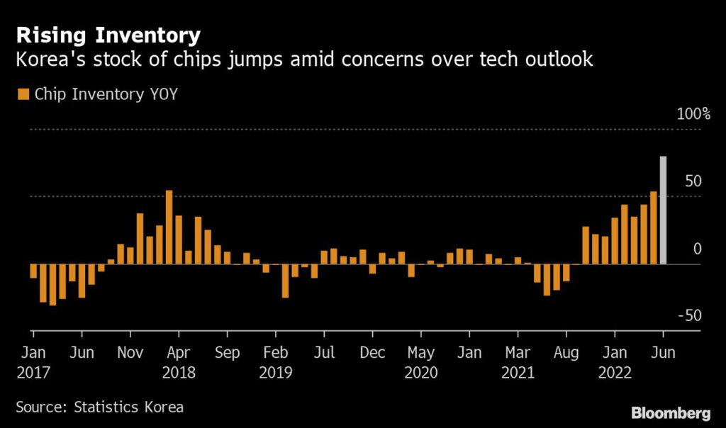 (Bloomberg) — South Korea’s semiconductor stockpiles expanded at the fastest pace in more than six years, adding to concern about the outlook for exports that drive the country’s economic growth.