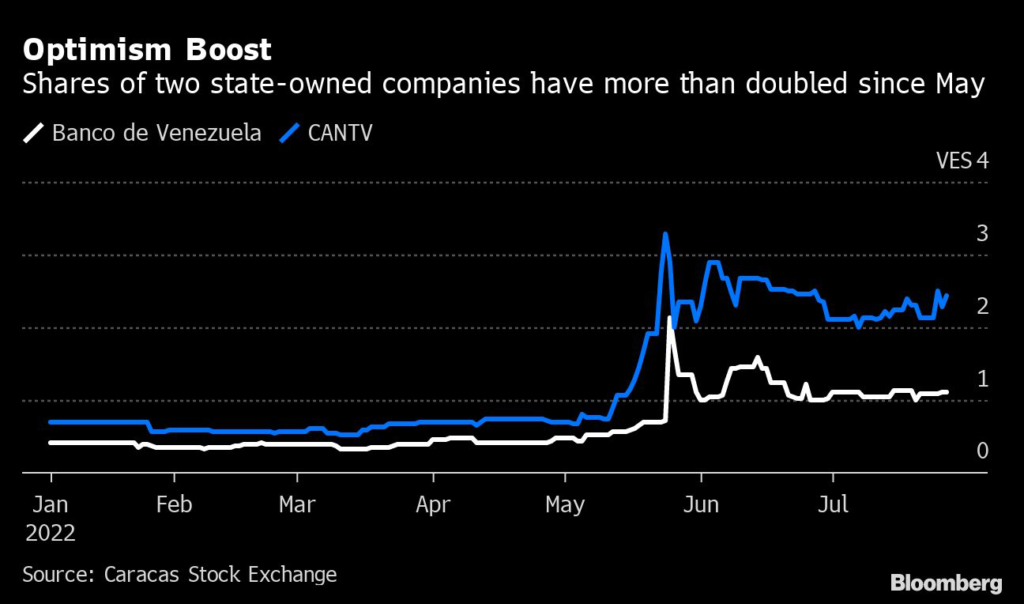 Cantv and Banco de Venezuela each have a small number of shares already trading on the bourse, and the price shot up after the government announced its plans for a stake sale in May.