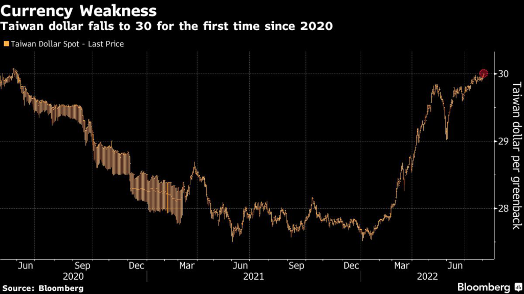 (Bloomberg) — The Taiwan dollar slid past a key psychological level of 30 per US dollar for the first time since June 2020 as a double whammy of heightened geopolitical risks and weaker economic growth weigh on the currency.