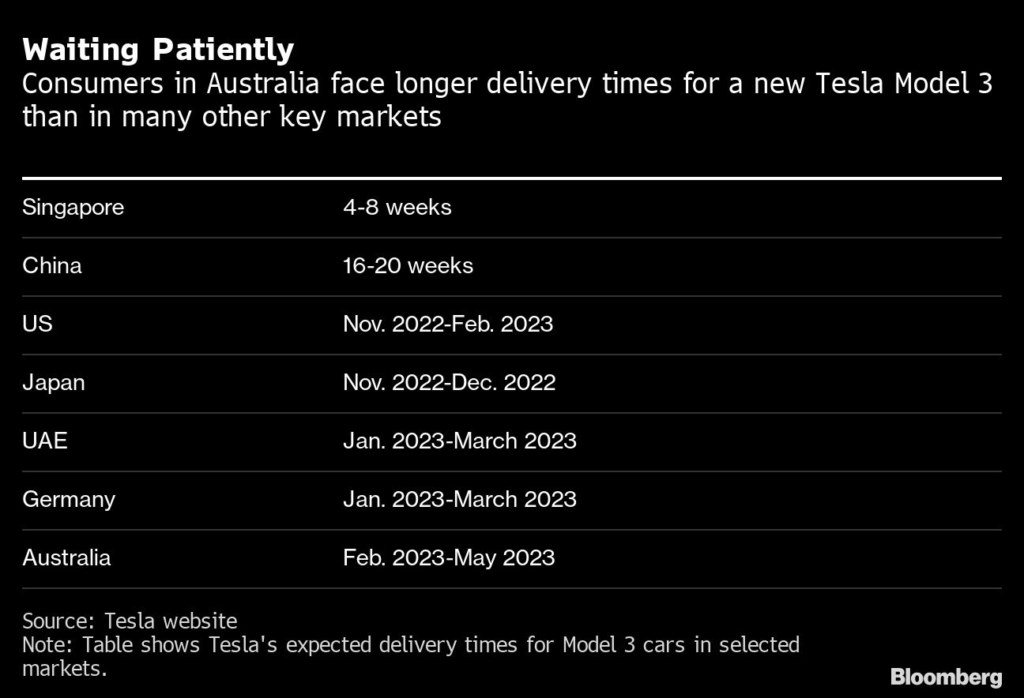 A top-of-the range Model 3 Performance costing A$91,600 ($64,200) ordered in Sydney today would be delivered between February and May 2023, according to Tesla’s website.