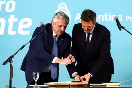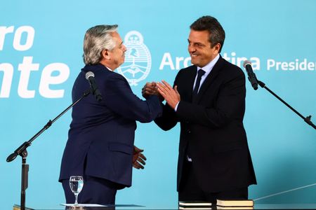 BUENOS AIRES (Reuters) -Argentina’s latest economy minister, Sergio Massa, formally took the reins of his newly-dubbed “superministry” on Wednesday, with expectations that he will announce spending cuts to calm markets amid a deepening economic crisis.