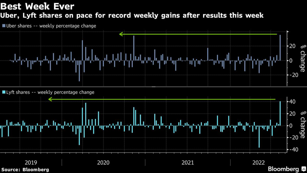 The week’s advance pared this year’s loss in Uber shares to 24%, while Lyft is still down 54%.