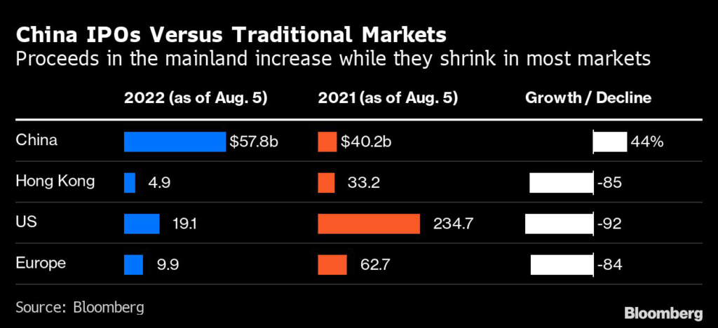 Initial public offerings on mainland exchanges have climbed to $57.8 billion so far in 2022, the largest ever for such a period, according to data compiled by Bloomberg.