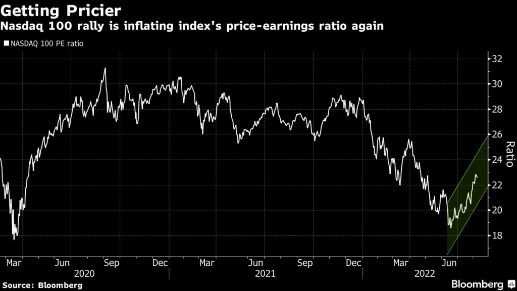 The tech-heavy index now trades at about 23 times forward earnings, up from a 27-month low in June of 18.6. However, it still trades about 28% cheaper than its September 2020 high.