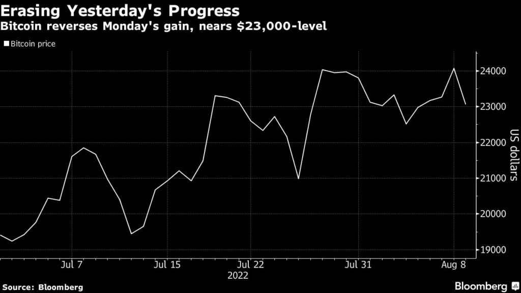 (Bloomberg) — Bitcoin resumed its slump on Tuesday, erasing all of the prior session’s gains and ending a four-day winning streak as volatility continues to whipsaw the crypto world.
