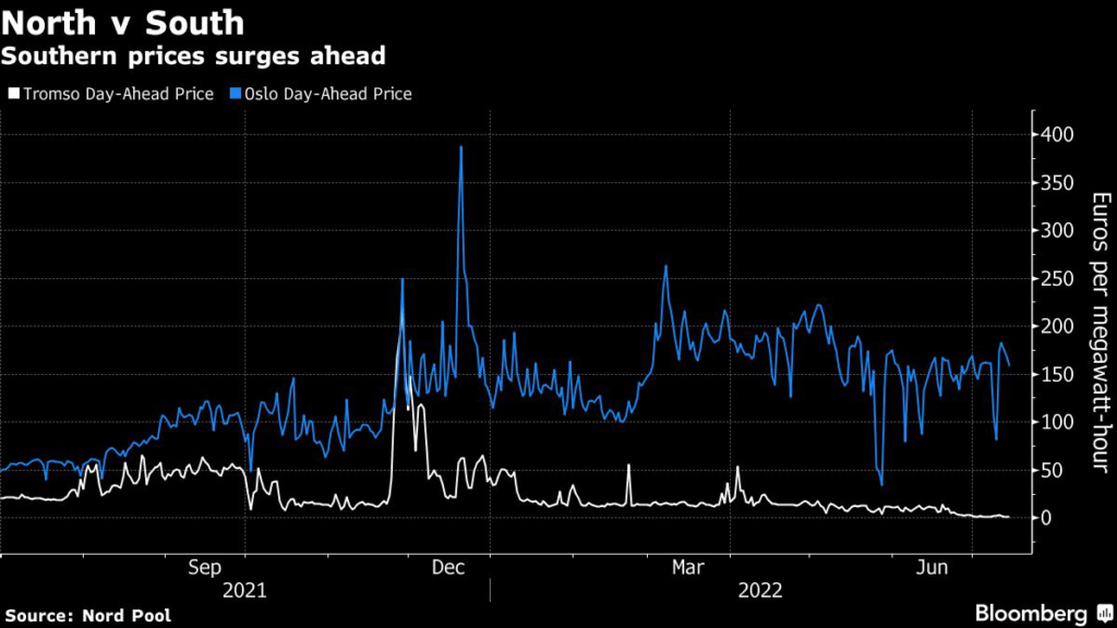 The huge difference is due to bottlenecks between the regional price areas. While there’s plenty of water available in the north for power generation, there’s not enough cable capacity to shift supplies south where most of the consumption is.