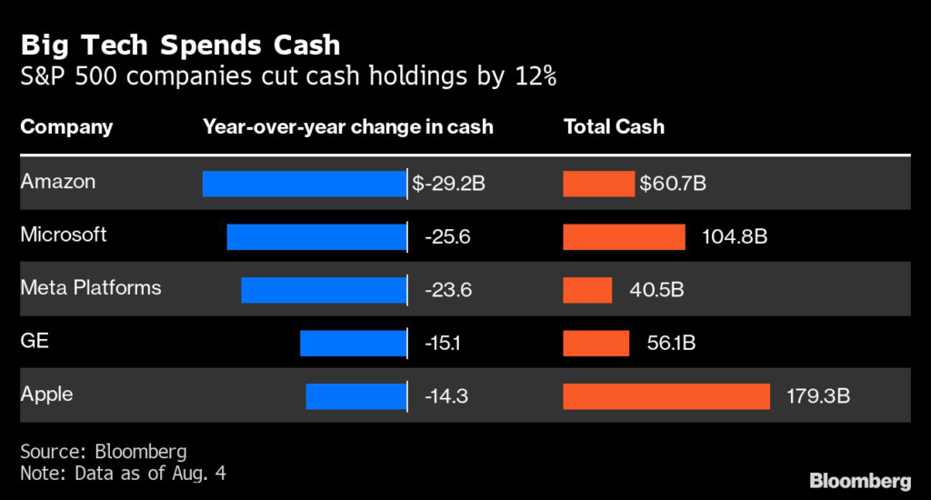 Amazon is leading the pack with a $29 billion cut to its cash pile, following by fellow mega-caps Microsoft Corp., Meta Platforms Inc. and Apple Inc. Apple, Microsoft and Meta have used cash to fund their share repurchase programs, while Amazon has the biggest capital expenditure budget in the group.