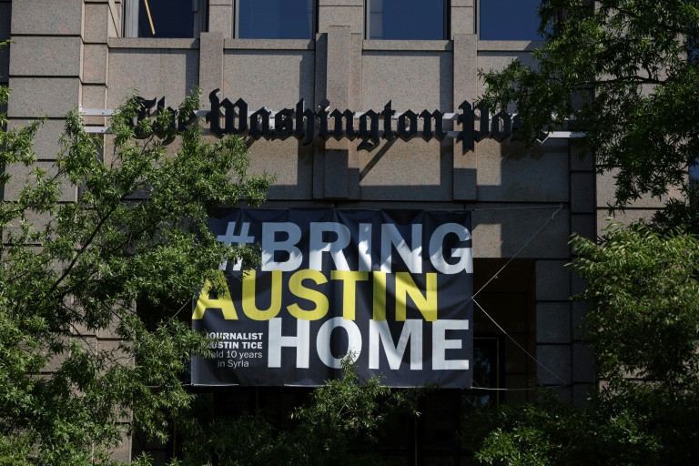 A banner reading "Bring Austin Home" hangs outside the headquarters of The Washington Post to mark the 10th anniversary of his abduction