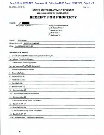 FBI agents took more than 30 items including more than 20 boxes, binders of photos, a handwritten note and the executive grant of clemency for Trump’s ally and longtime adviser Roger Stone, a list of items removed showed.
