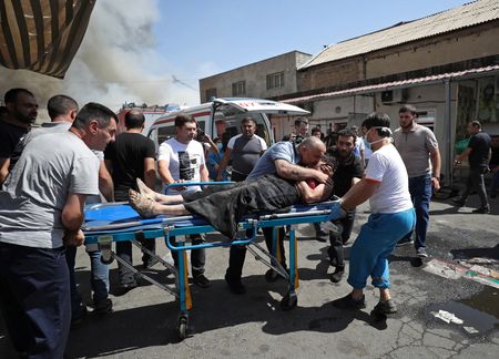 (Reuters) -Blasts ripped through a fireworks warehouse in a shopping mall in the Armenian capital of Yerevan on Sunday, Russian news agencies reported, killing three people and injuring more than 60.