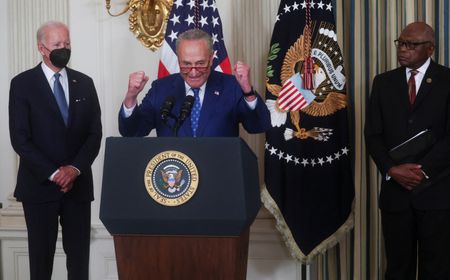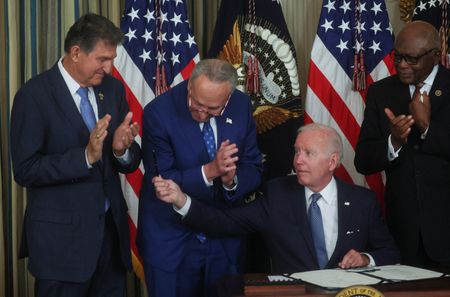 At a White House event, Biden was joined by Democratic leaders including Senator Joe Manchin of West Virginia, whose support was crucial to passage of the Inflation Reduction Act along party lines, after he blockaded much larger measures pushed by the White House.