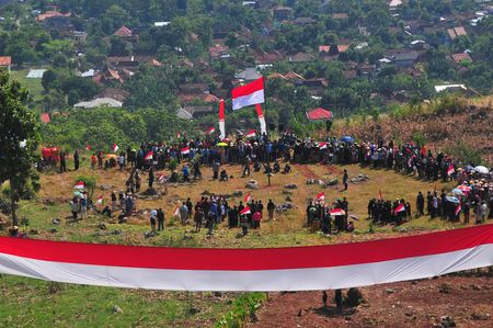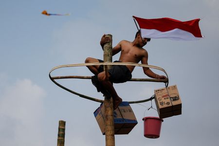 JAKARTA (Reuters) – Teams of Indonesians clambered over each other on Wednesday to reach prizes hanging from the top of slippery tree trunks in an annual competition held to celebrate the country’s Independence Day.