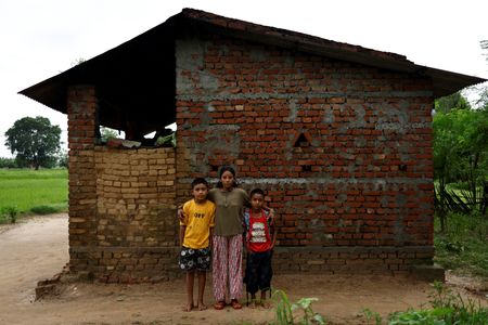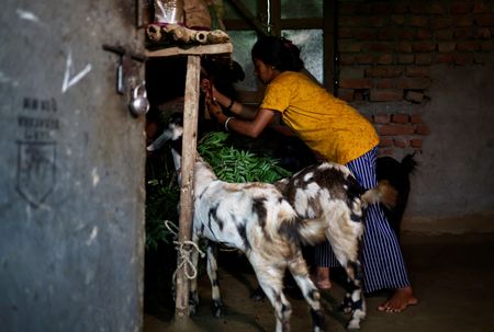Her day begins at dawn in a tin-roofed two-room structure of bare bricks shared with sons Resham and Arjun and her mother-in-law, with their goats penned into one area. Their home lacks a toilet, so the family use a nearby plot of public land instead.