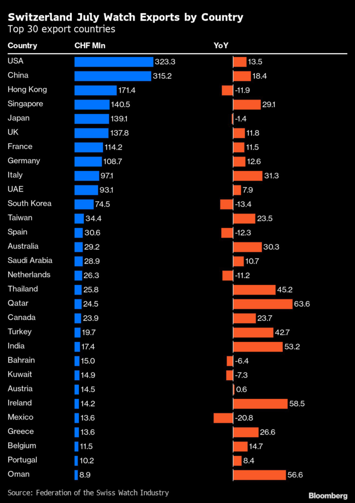 With the exception of Hong Kong, South Korea and Japan, Swiss watch exports in July to most major markets in Asia and Europe increased by double digit percentages.