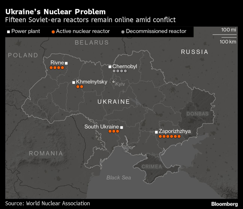 Zaporizhzhia’s designed to cover a fifth of Ukraine’s electricity demand and any abrupt disconnection would ripple through transmission networks that need to precisely match supply with demand in order remain stable.