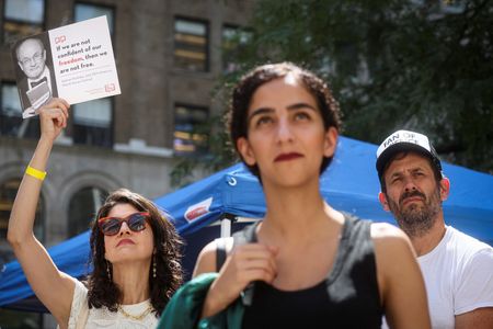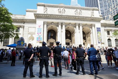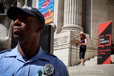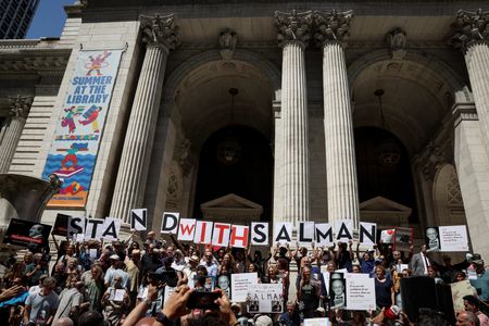 NEW YORK (Reuters) – Under the watch of counterterrorism officers and police in tactical gear, hundreds of people gathered in front of the New York Public Library on Friday to show support for Salman Rushdie, the author stabbed multiple times at a literary event a week ago.