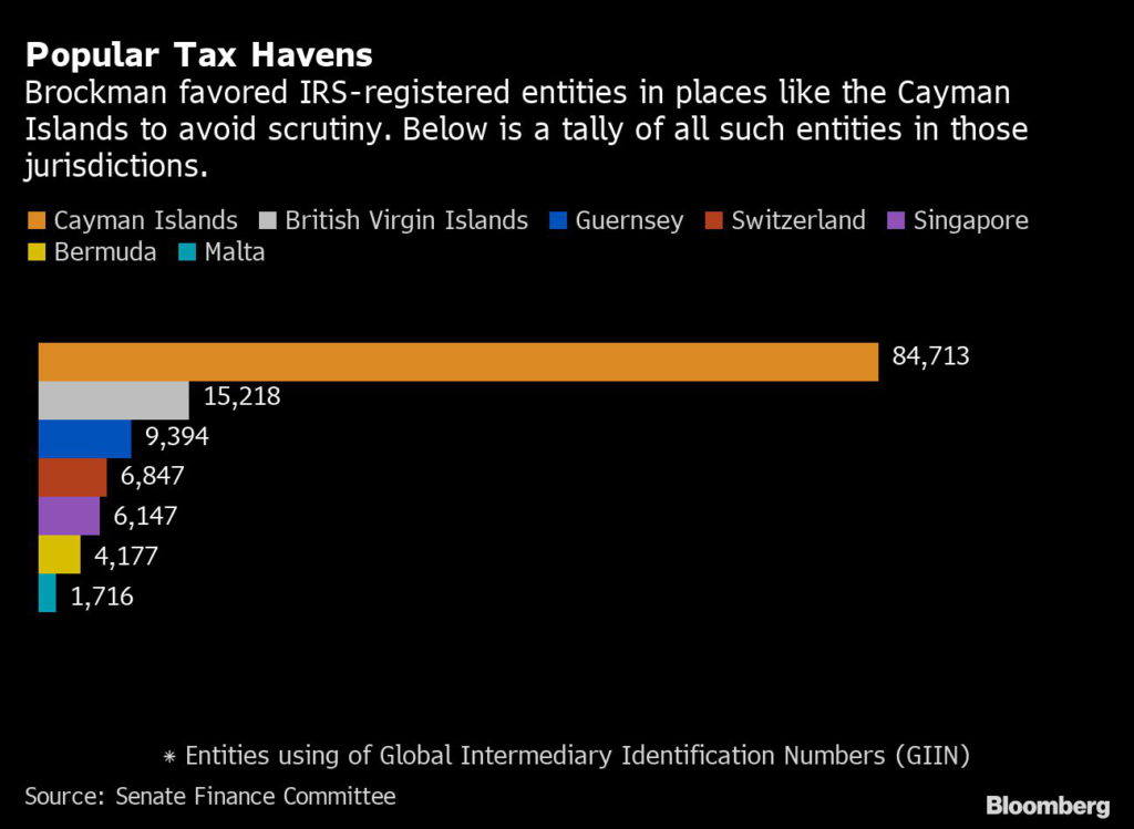 Senate investigators, citing court documents, said Brockman set up entities in the tax havens of Bermuda, Cayman Islands, Malta, Nevis, Switzerland, Singapore, Guernsey and the British Virgin Islands.