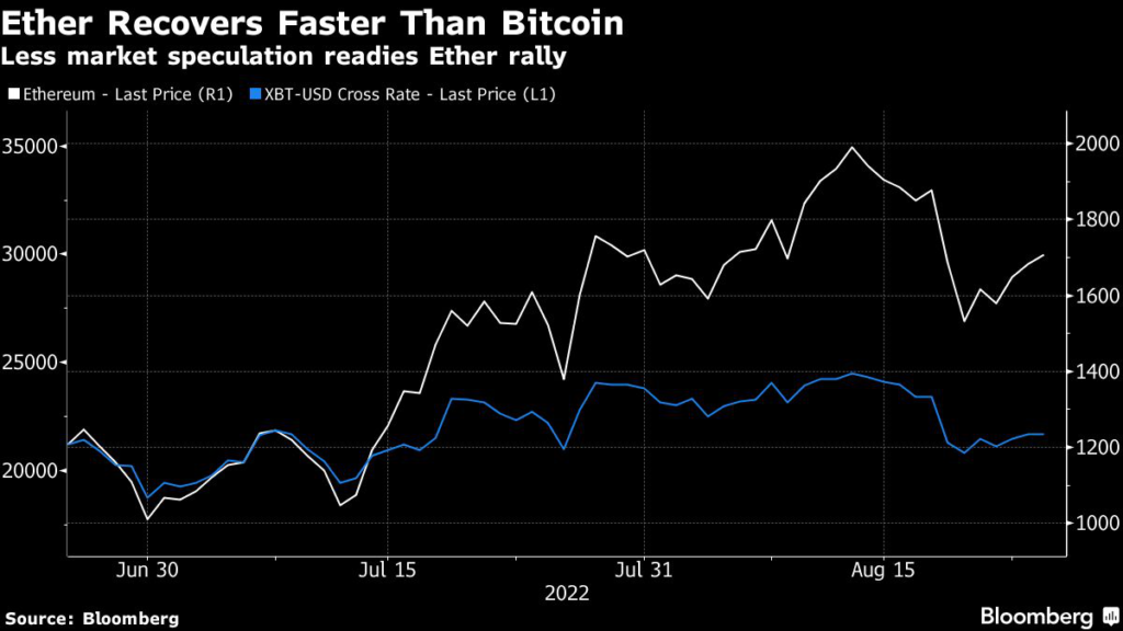 (Bloomberg) — Ether is outperforming Bitcoin for a third consecutive day amid expectations that the intermittent bouts of optimism over the pending upgrade of the Ethereum blockchain will finally take root.