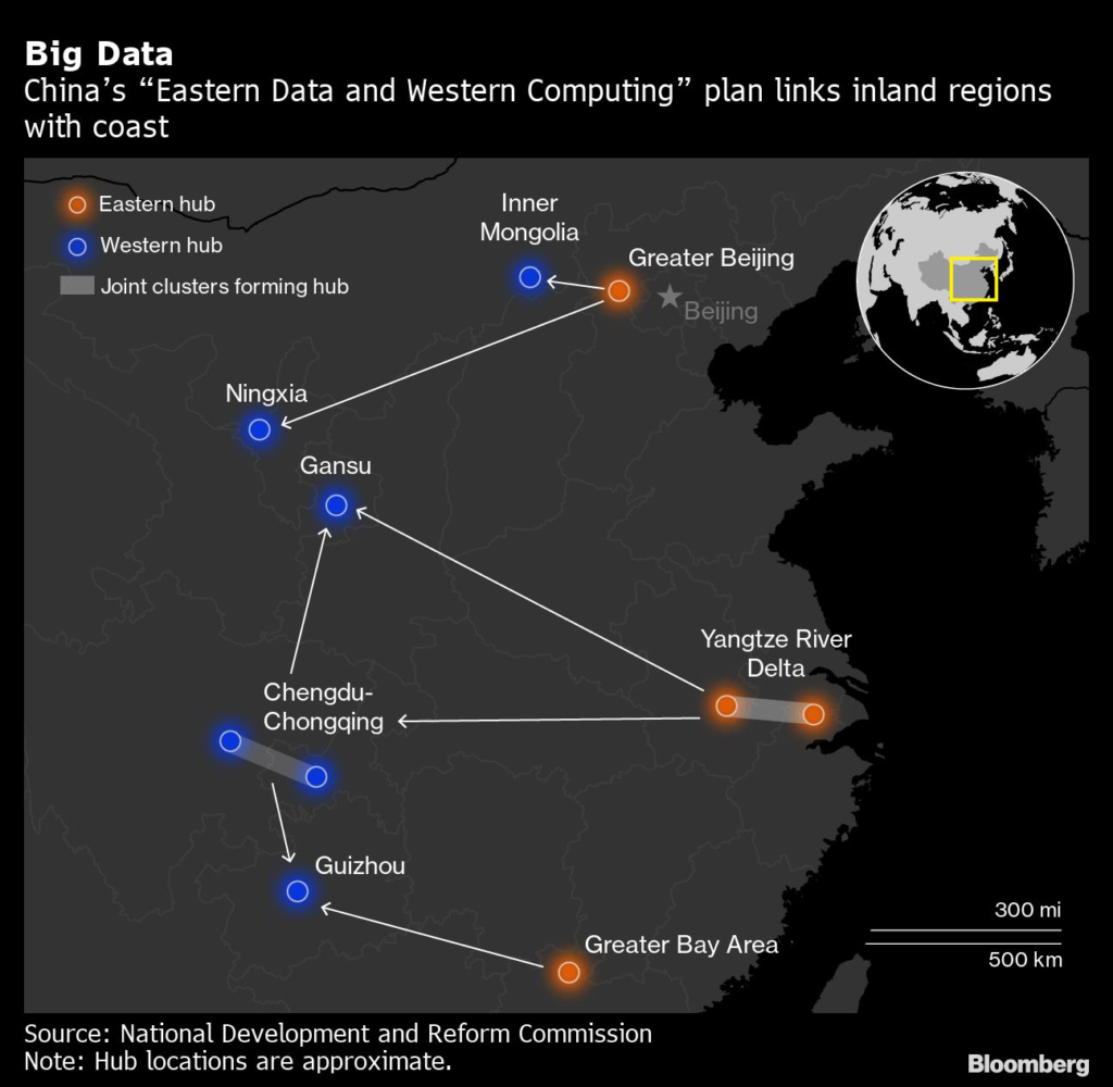 As part of an effort to build a more digital economy, China’s “East Data West Computing” plan involves building huge data centers in poorer Western provinces to hold data generated by internet companies based in the east.