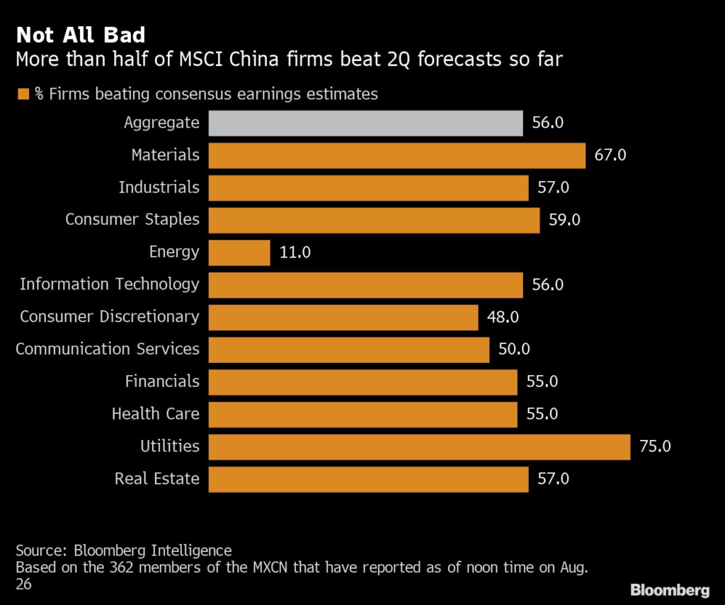 Aggregate earnings per share have delivered an upward surprise of 9.4% for over half of the 715 MSCI China Index members that have reported second-quarter results, as per calculations by Bloomberg Intelligence.