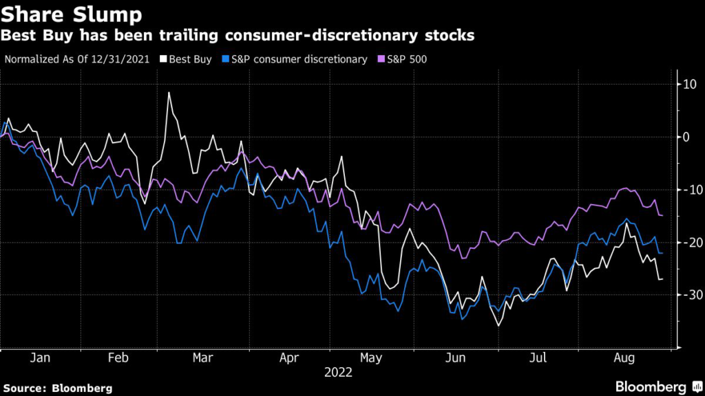 Best Buy is contending with flagging sales of discretionary goods as soaring US inflation forces shoppers to pay more for groceries and other essentials.
