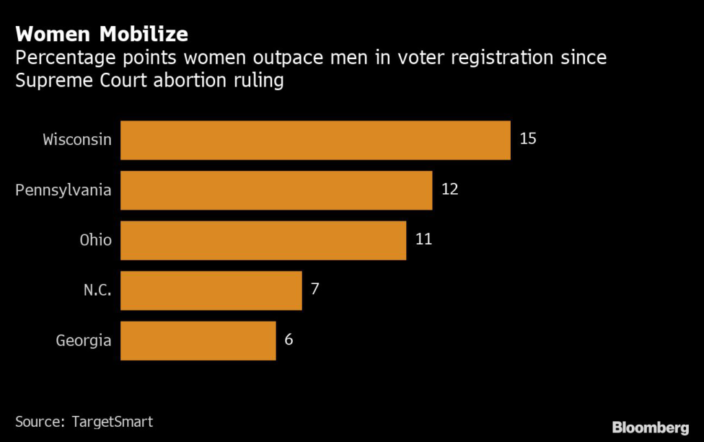 (Bloomberg) — The number of women signing up to vote has jumped in key midterm battleground states since the Supreme Court struck down a national right to abortion, with Democrats benefiting as the issue pushes to the forefront in campaigns.