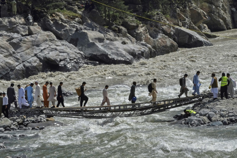 A vehicle bridge across the Swat River was destroyed by a flash flood, and now the only way across is by a rickety makeshift footbridge.