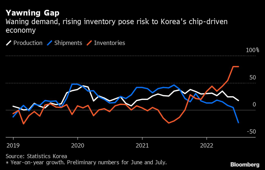 (Bloomberg) — South Korean chipmakers recorded their first fall in factory shipments in almost three years in July, highlighting weakening demand for semiconductors that serve as a barometer for the global economy.