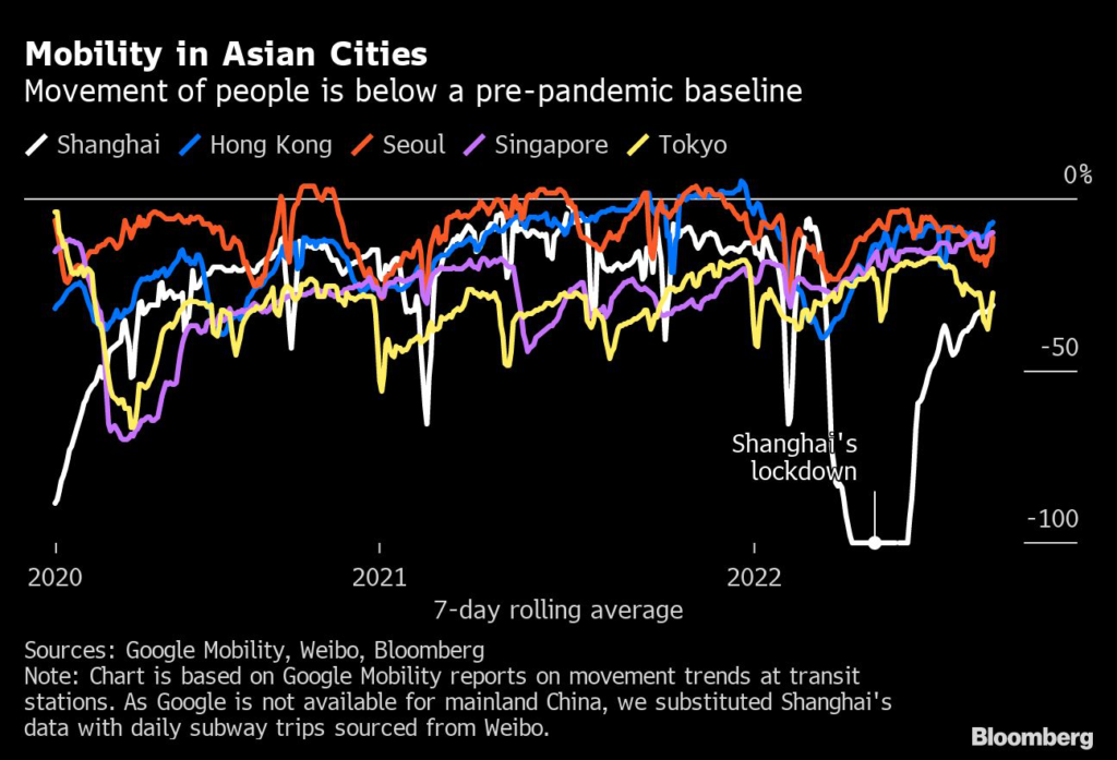 As a result, demand for everything from dining out to movies and tourism are still far below pre-lockdown levels, while some indicators show Shanghai is taking longer to recover than Hong Kong and Singapore after rules were eased in those cities.